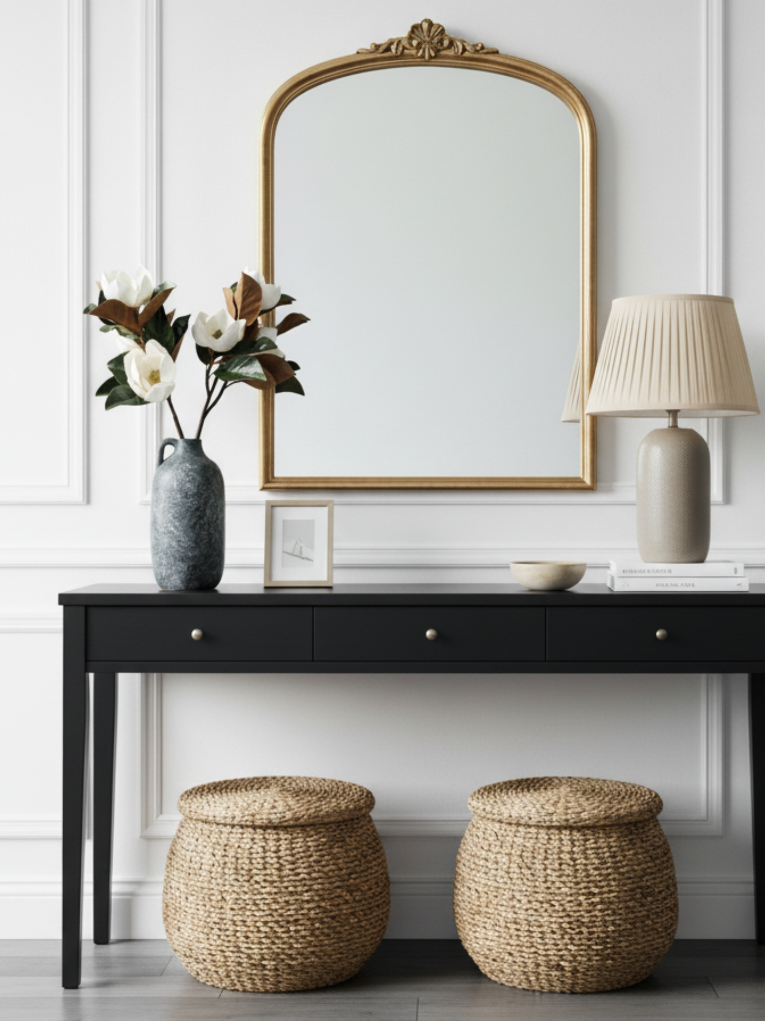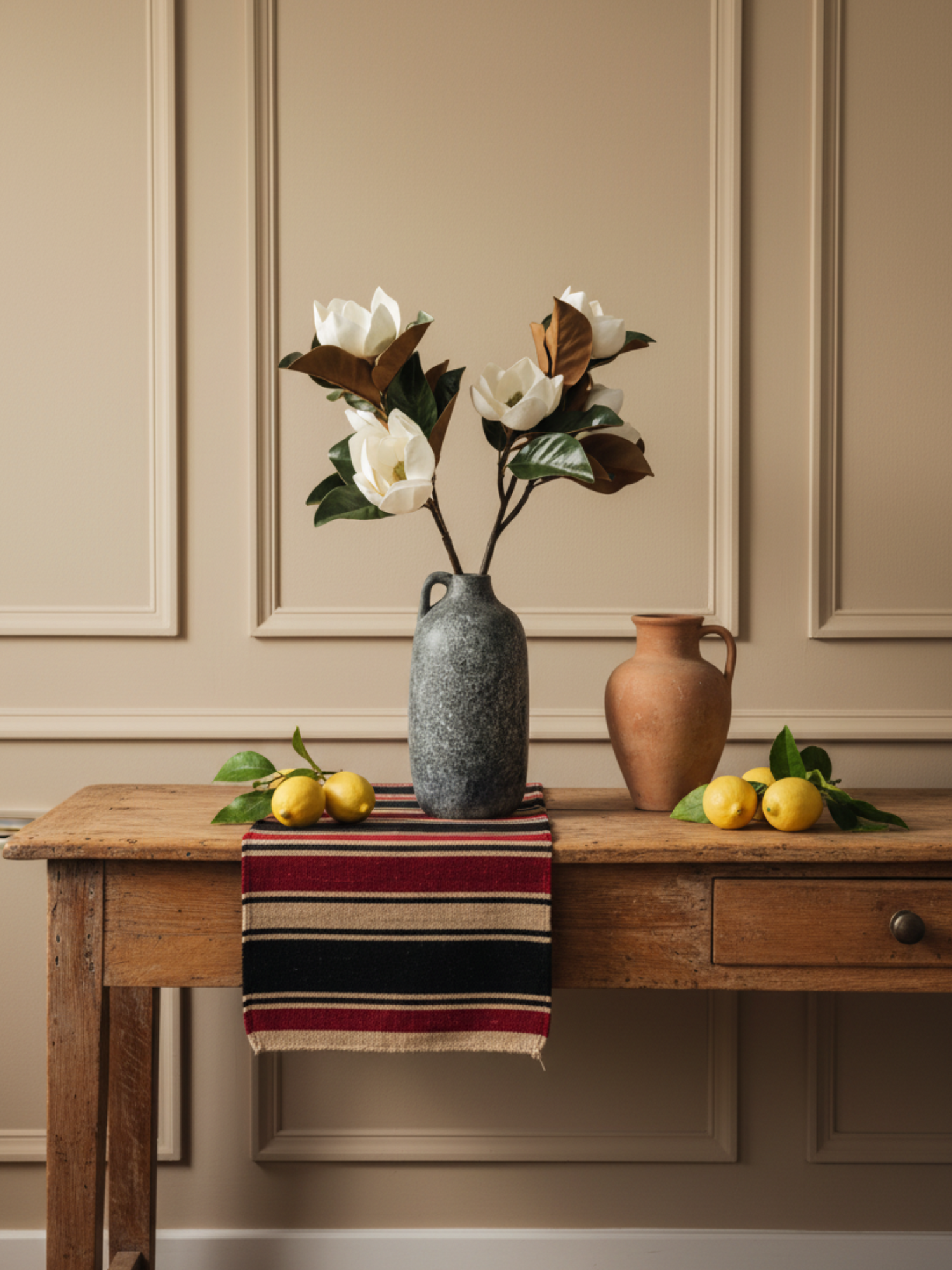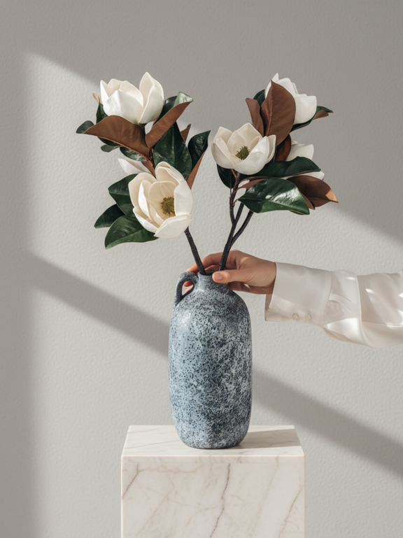 Composición: 2 ramas de magnolio con 3 flores cada una.