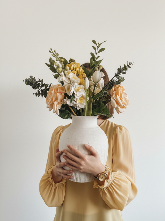 Un ramo delicado y luminoso que combina la suavidad del ranúnculo blanco y las rosas crema con la frescura del persian lily y el delphinium blanco. Las ramas de eucalipto y el follaje verde aportan un toque natural y equilibrado, creando una composición fresca y serena, ideal para dar vida y armonía a cualquier espacio.
