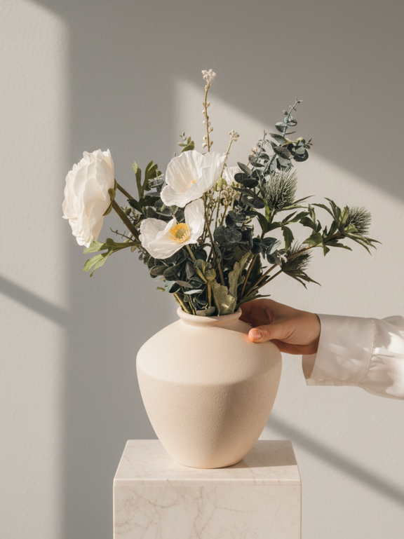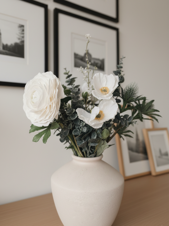 Un ramo sencillo y elegante que combina la frescura del eucalipto con flores blancas y detalles naturales. El ranúnculo, el algodón y el cosmo aportan suavidad, mientras que el eryngo y la semilla le entregan textura y carácter. Ideal para dar un aire sereno y acogedor a cualquier espacio.