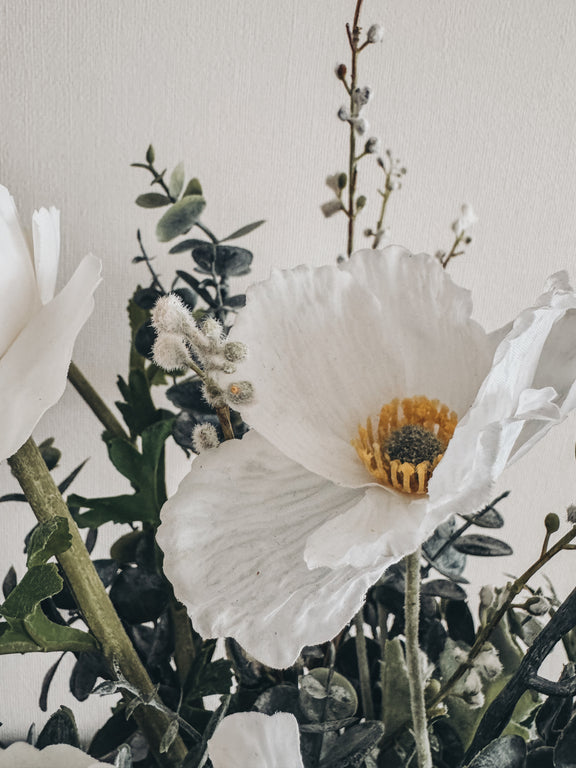 Composición: 3 eucalipto, 1 cosmo blanco, 1 vara de algodón blanca, 1 ranúnculo blanco, 1 eryngo, 1 vara de semillas.