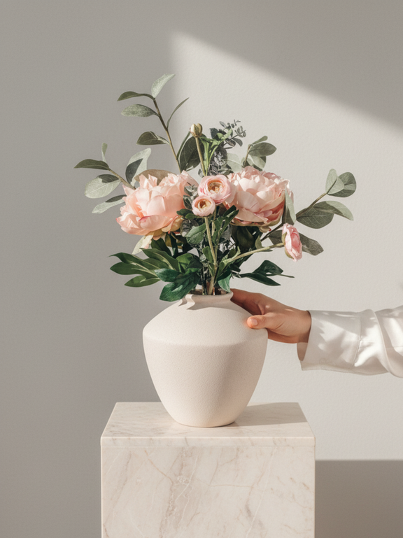 Un ramo delicado y romántico que combina la frescura del eucalipto y la suavidad de las hojas dusty con la elegancia de las peonías y mini ranúnculos rosados. Perfecto para aportar un toque armonioso y luminoso a cualquier espacio. Incluye florero, que aporta calidez a cualquier rincón.