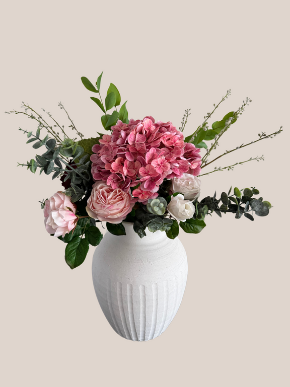 Un ramo de tonos suaves y acogedores que combina la delicadeza de las hortensias y las rosas, creando una composición que transmite calma y calidez. El ranúnculo aporta un toque sutil de profundidad, mientras que las varas de algodón, el eucalipto y el follaje verde suman naturalidad y textura, dando como resultado un ramo sereno, perfecto para acompañar espacios con un aire acogedor y lleno de encanto.