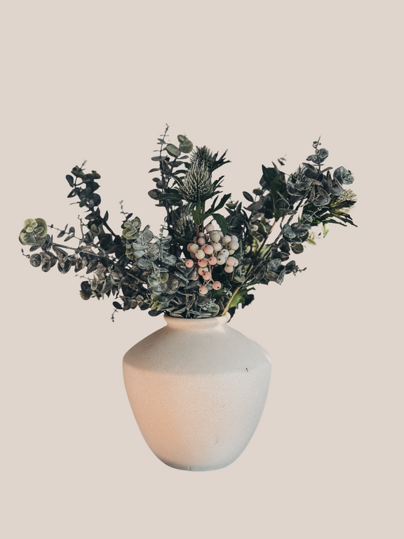 Un ramo simple y con carácter, donde la frescura del eucalipto se encuentra con la textura única del eryngo. Una propuesta natural y elegante que aporta un aire relajado a cualquier espacio.