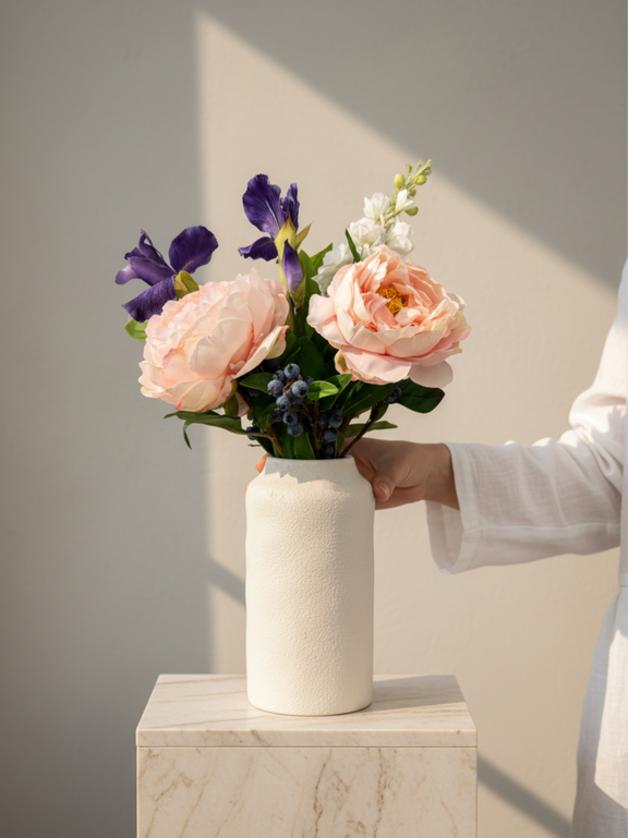 Un ramo delicado y armonioso, que combina la suavidad de las peonías con la frescura del iris y la elegancia del delphinium. Los arándanos y la rama aportan un fondo sutil que armoniza el arreglo, creando una composición llena de vida y equilibrio.